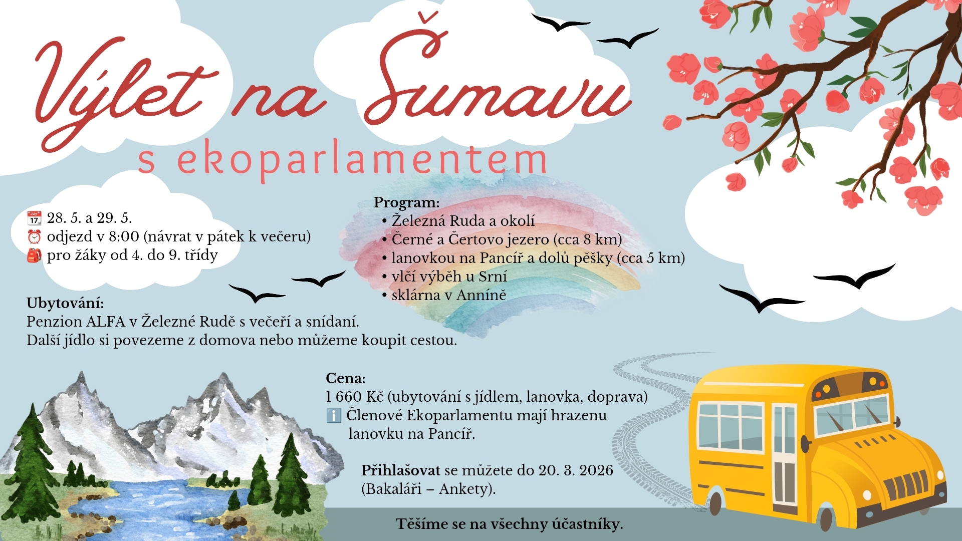 zveme všechny žáky od 4. do 9. třídy na dvoudenní přírodovědně zaměřený výlet do Železné Rudy a okolí.