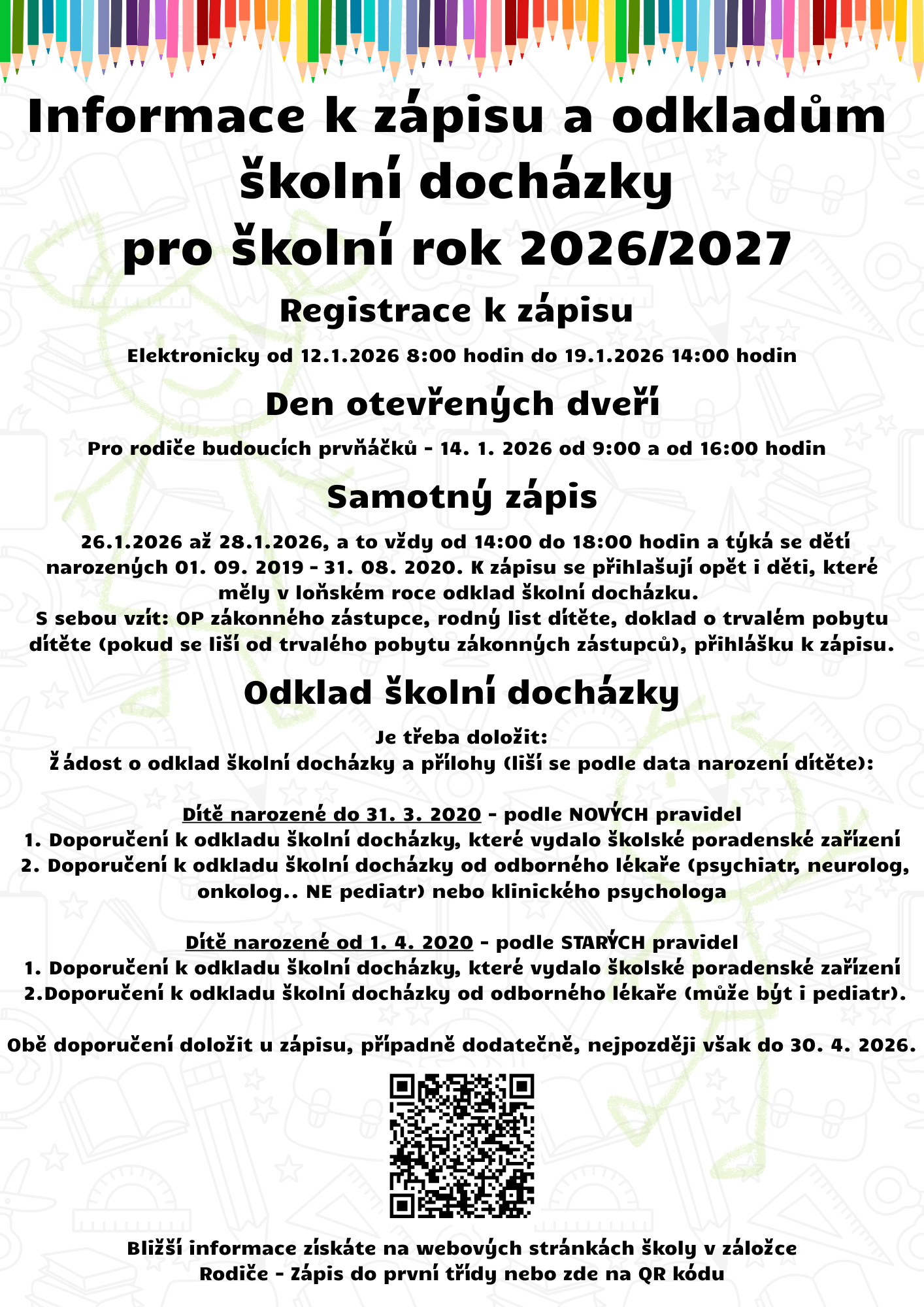 V případě žádosti o odklad povinné školní docházky doporučujeme rodičům objednat se k vyšetření (posouzení školní zralosti) v PPP co nejdříve, aby obě doporučení bylo možno doložit u zápisu, případně dodatečně, nejpozději však do 30. 4. 2026.