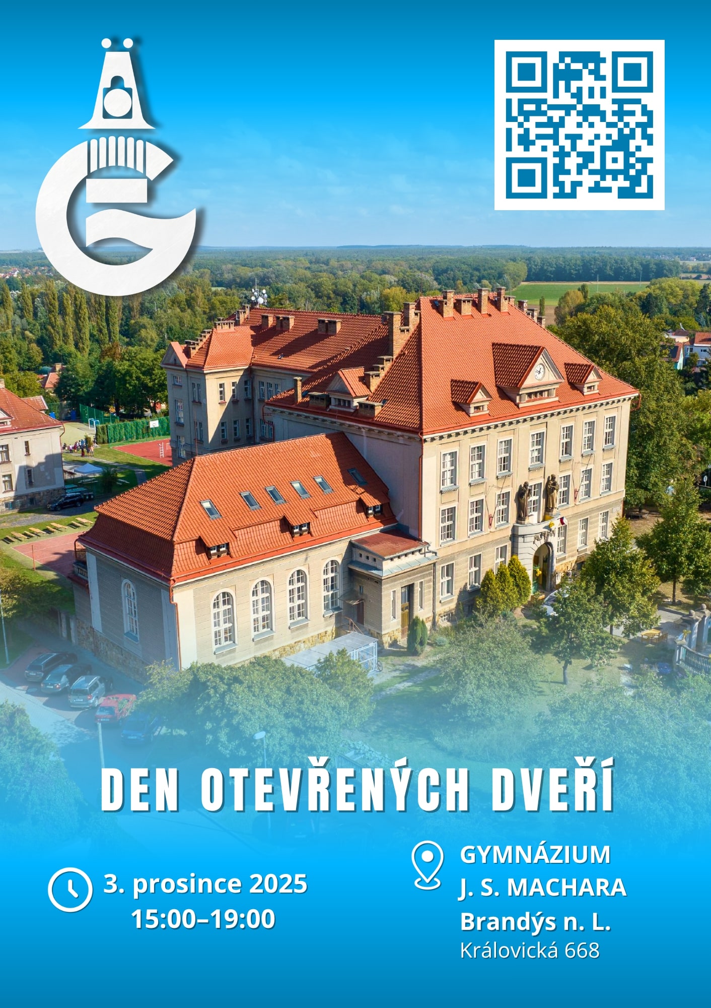 Den otevřených dveří proběhne dne 3. 12. 2025 od 15.00 hodin v budově naší školy Gymnázia J. S. Machara v Brandýse nad Labem.